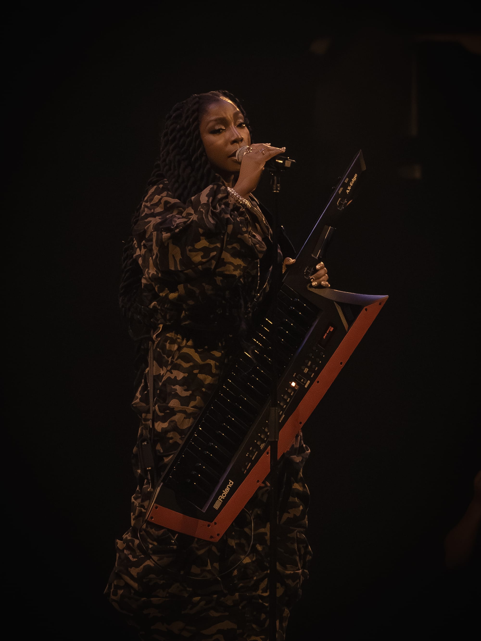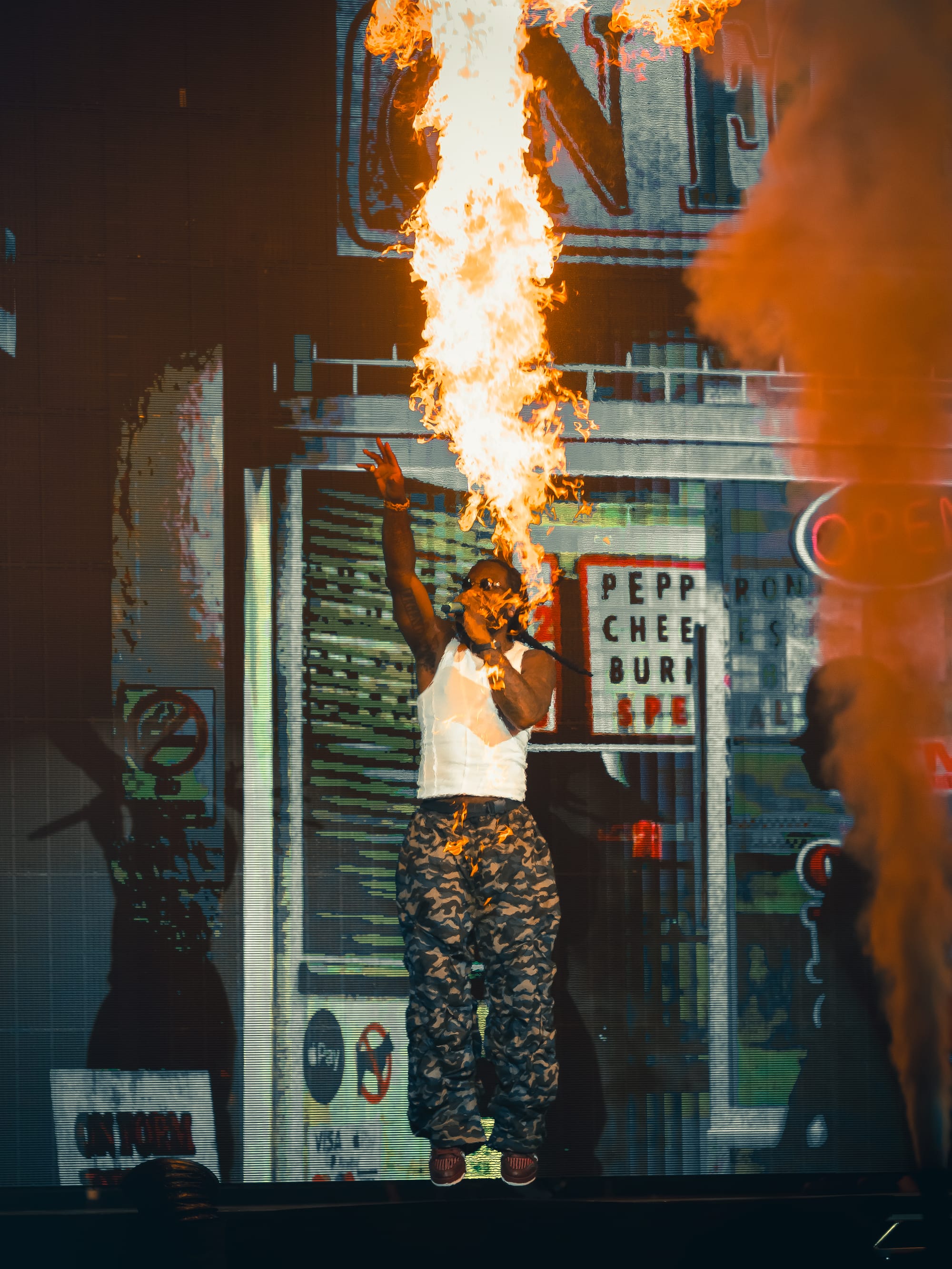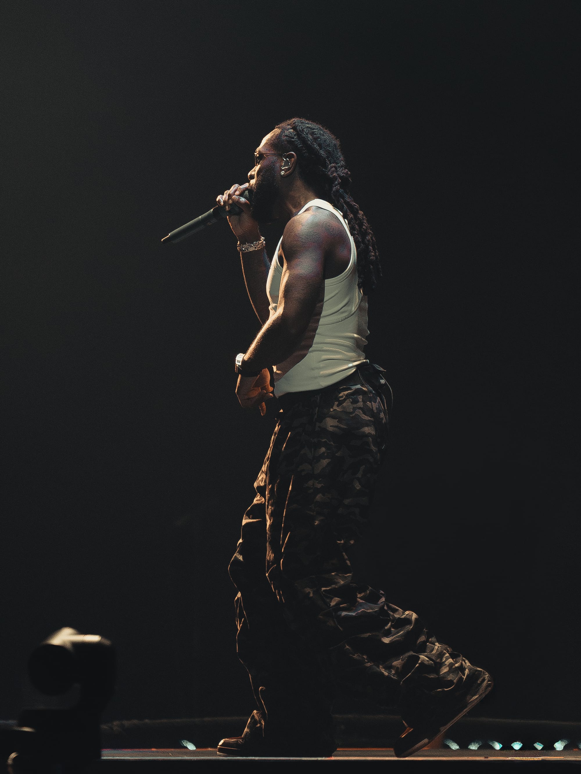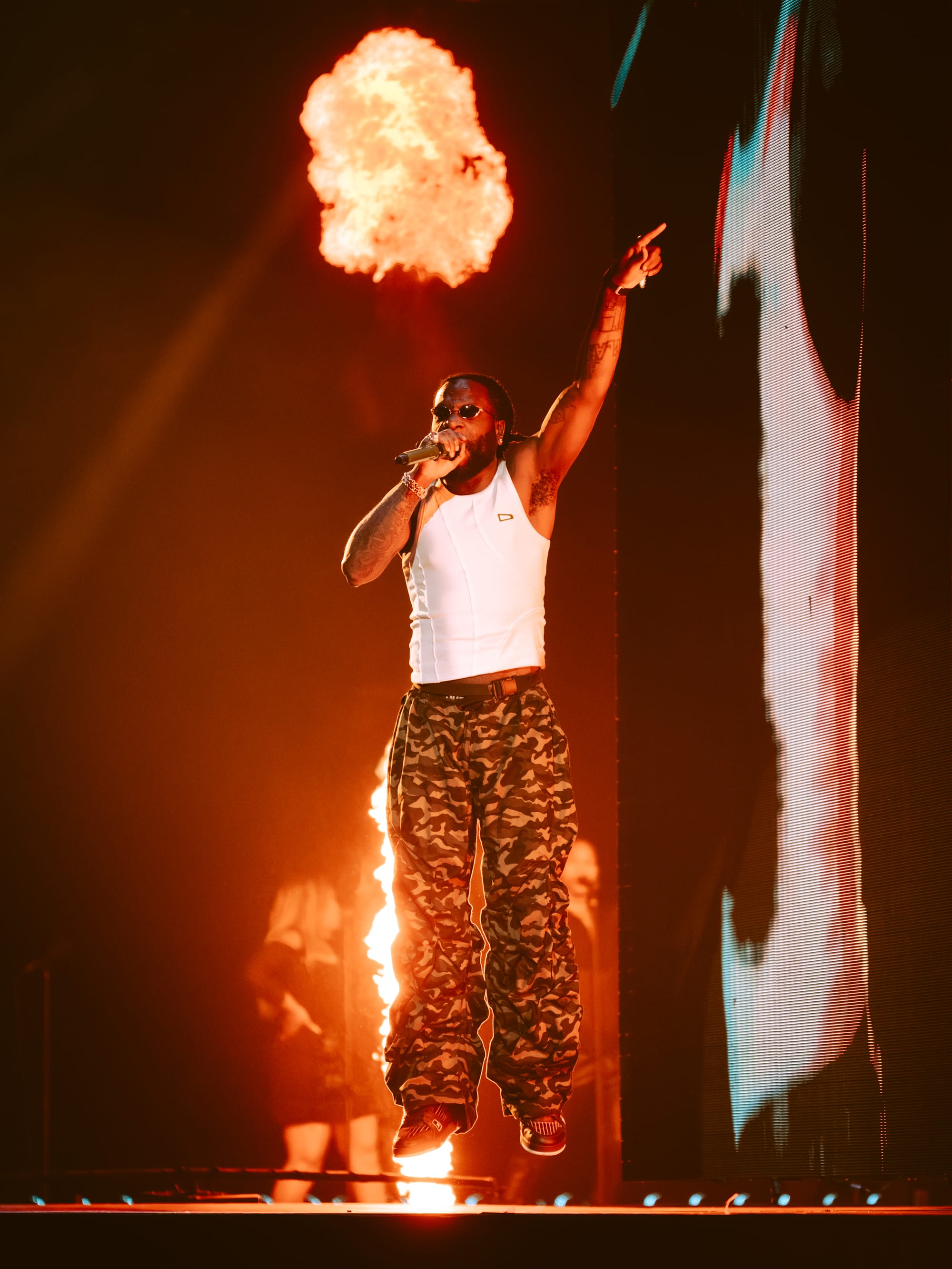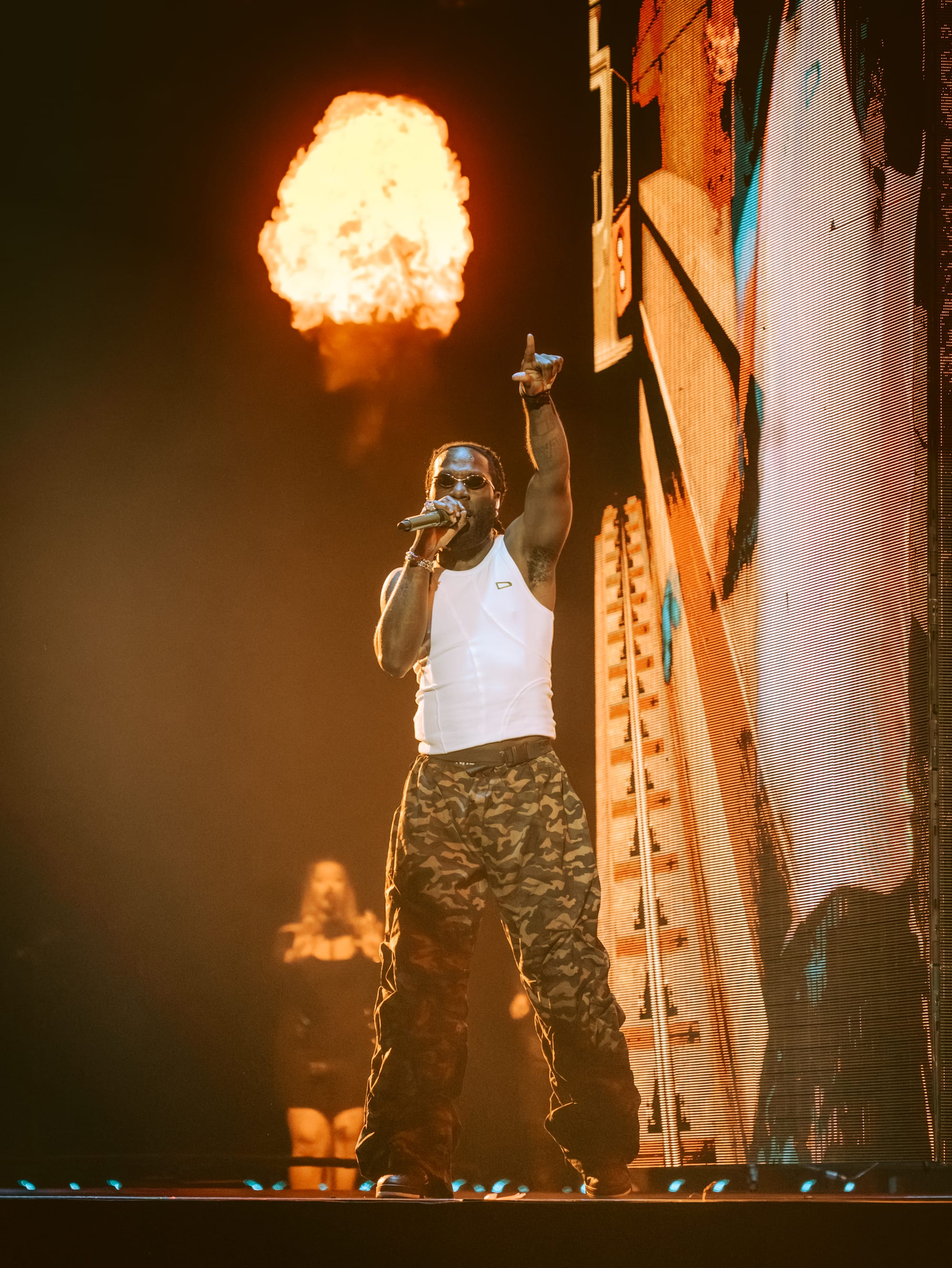 As the night progressed, crowd favorites like “On the Low” and “Talibans II” kept the arena moving, with bursts of flames and smoke cutting through the set as recurring production elements. During “Anybody,” the crowd locked into the song’s chants, feeding off the live band as the energy in the room peaked. The set was anchored by live instrumentation and drummers, while a rotating group of dancers, some in carnival-inspired costumes, brought added movement and visual depth to the performance.