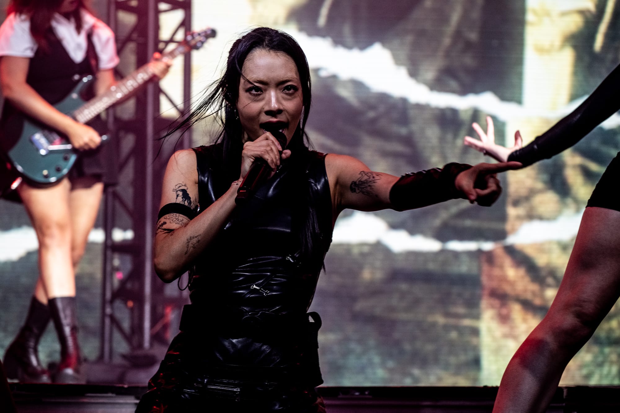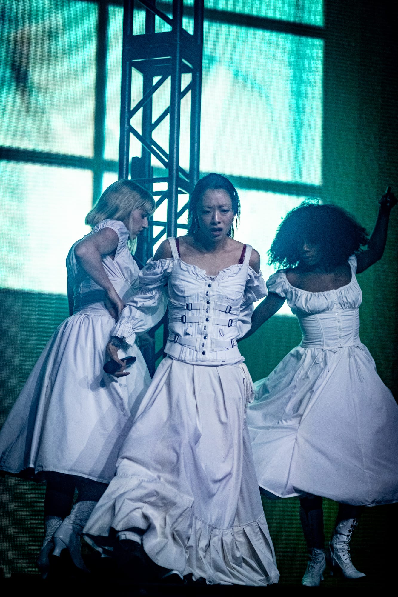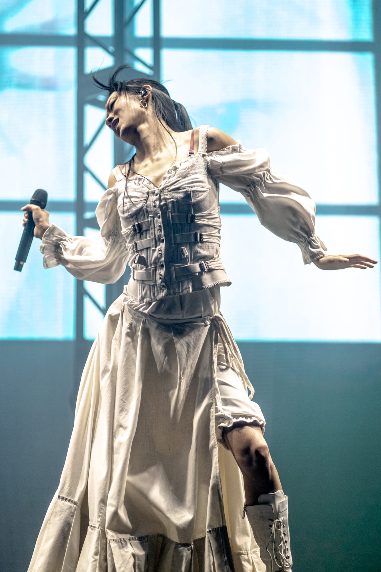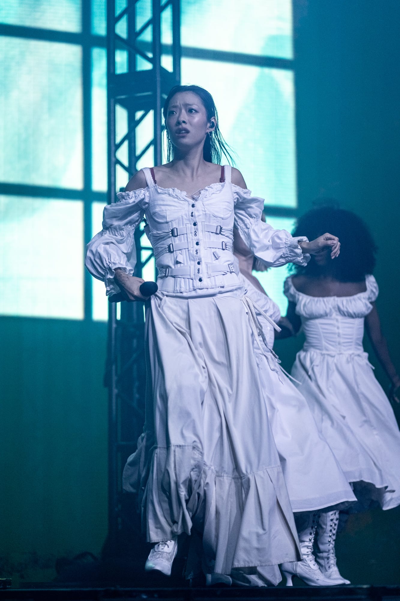 The stage was dark; you could only see the silhouette of Rina Sawayama as she came out on stage, as a very hypnotizing introduction video started playing on the backdrop screen. The video ended, and Rina began singing the intro to her opening song, “Hold the Girl.” Standing on stage, Rina wore a white dress, the top adorned with belts and many buttons. Similar to the “Hold the Girl” music video, where Rina is trying to escape a house but somehow always ends up back in the room she started in, she reenacts the element of escapism with a perplexed look on her face as her backup dancers keep pulling her back. The first act continued, lights flashing to match the storm clouds and lightning on the backdrop, and a surprise to the crowd as Rina rips off the bottom part of her dress to reveal a different variant to this outfit. The first act finishes with the song “Hurricanes” as Rina slips away, leading into the first interlude of the night.