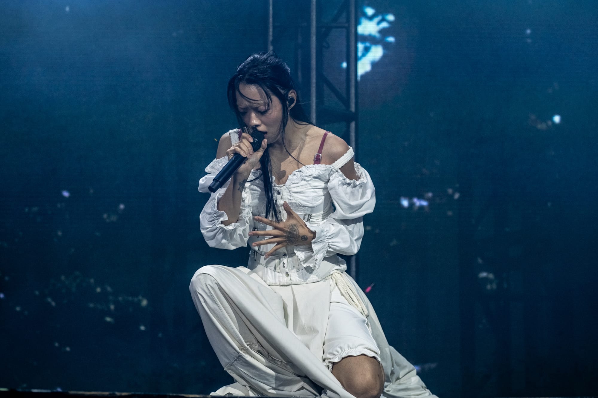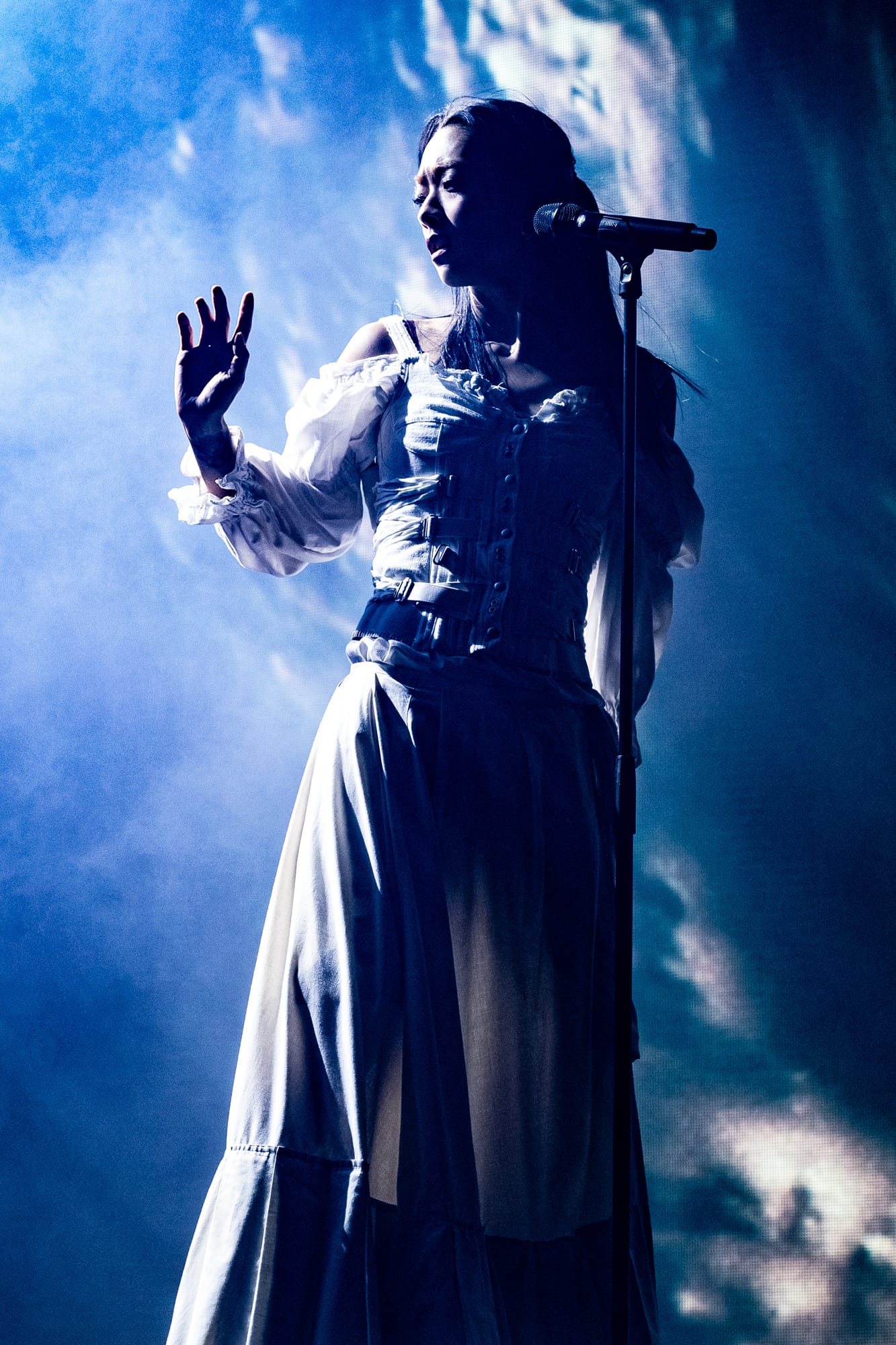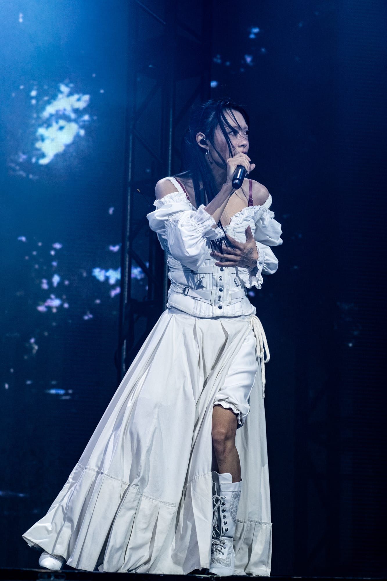 The stage was dark; you could only see the silhouette of Rina Sawayama as she came out on stage, as a very hypnotizing introduction video started playing on the backdrop screen. The video ended, and Rina began singing the intro to her opening song, “Hold the Girl.” Standing on stage, Rina wore a white dress, the top adorned with belts and many buttons. Similar to the “Hold the Girl” music video, where Rina is trying to escape a house but somehow always ends up back in the room she started in, she reenacts the element of escapism with a perplexed look on her face as her backup dancers keep pulling her back. The first act continued, lights flashing to match the storm clouds and lightning on the backdrop, and a surprise to the crowd as Rina rips off the bottom part of her dress to reveal a different variant to this outfit. The first act finishes with the song “Hurricanes” as Rina slips away, leading into the first interlude of the night.
