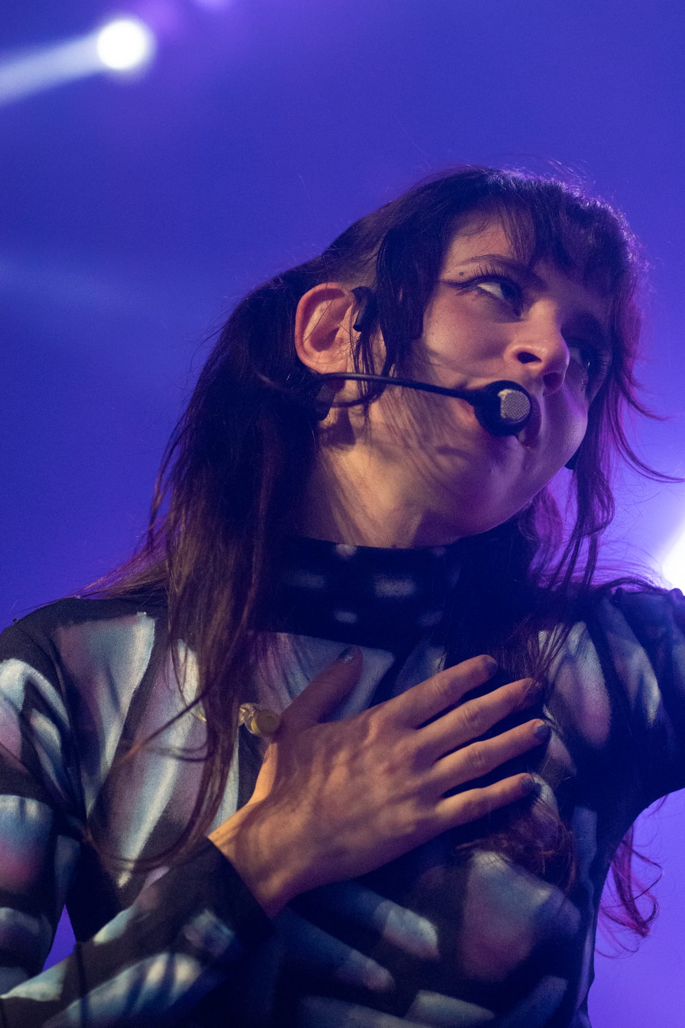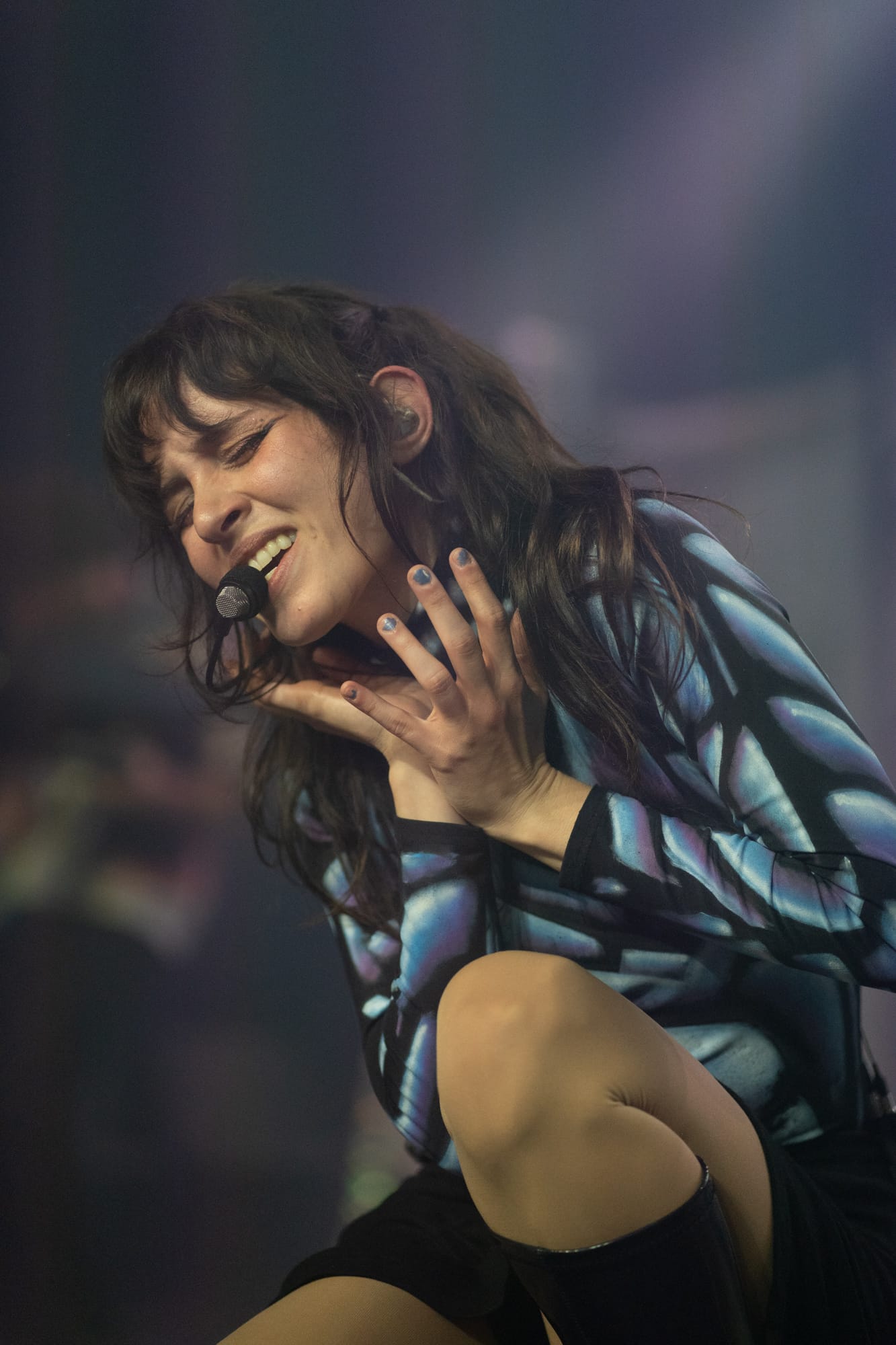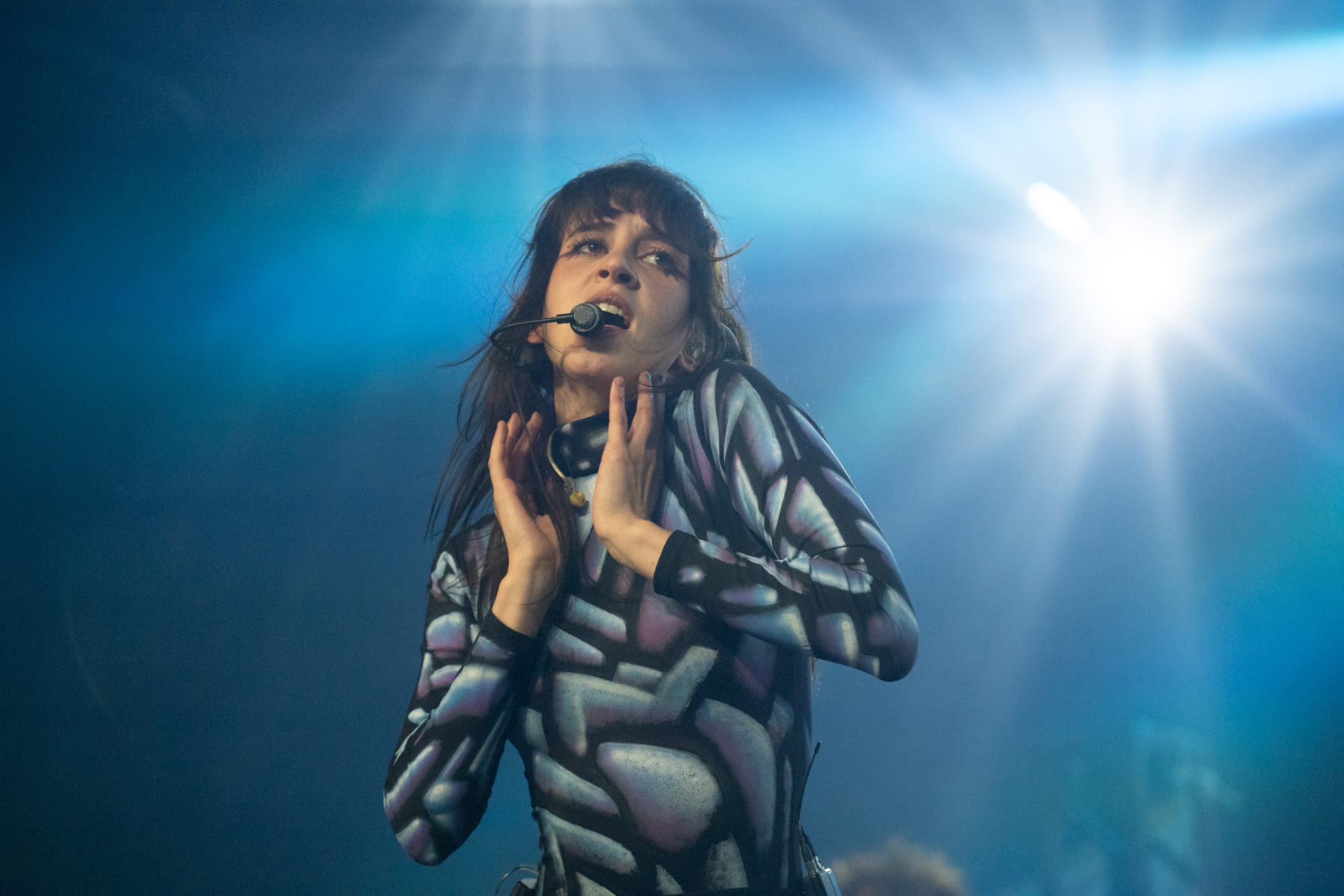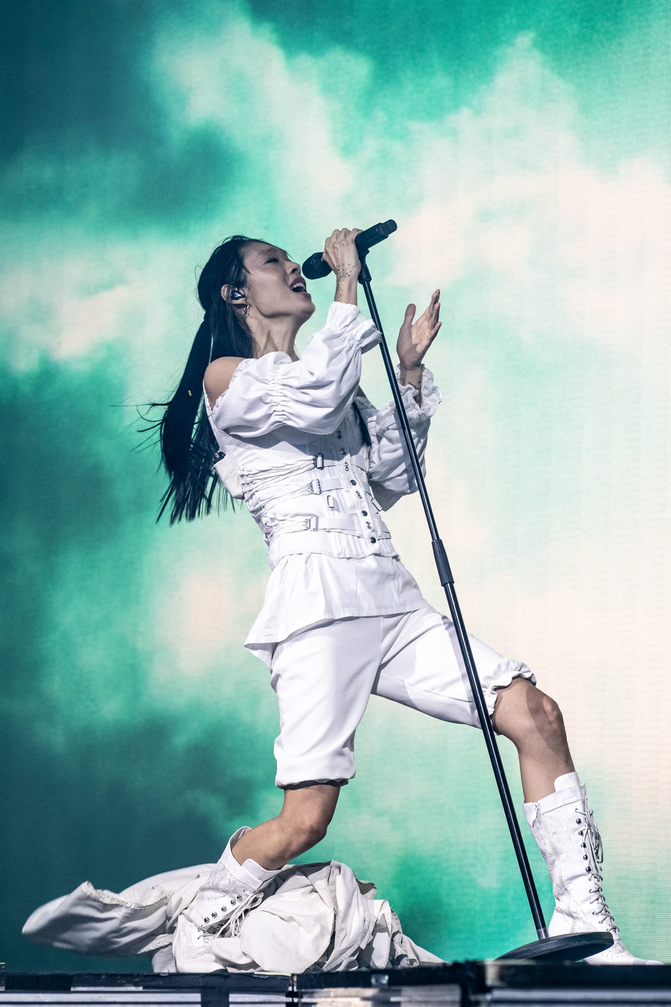 The stage was dark; you could only see the silhouette of Rina Sawayama as she came out on stage, as a very hypnotizing introduction video started playing on the backdrop screen. The video ended, and Rina began singing the intro to her opening song, “Hold the Girl.” Standing on stage, Rina wore a white dress, the top adorned with belts and many buttons. Similar to the “Hold the Girl” music video, where Rina is trying to escape a house but somehow always ends up back in the room she started in, she reenacts the element of escapism with a perplexed look on her face as her backup dancers keep pulling her back. The first act continued, lights flashing to match the storm clouds and lightning on the backdrop, and a surprise to the crowd as Rina rips off the bottom part of her dress to reveal a different variant to this outfit. The first act finishes with the song “Hurricanes” as Rina slips away, leading into the first interlude of the night.