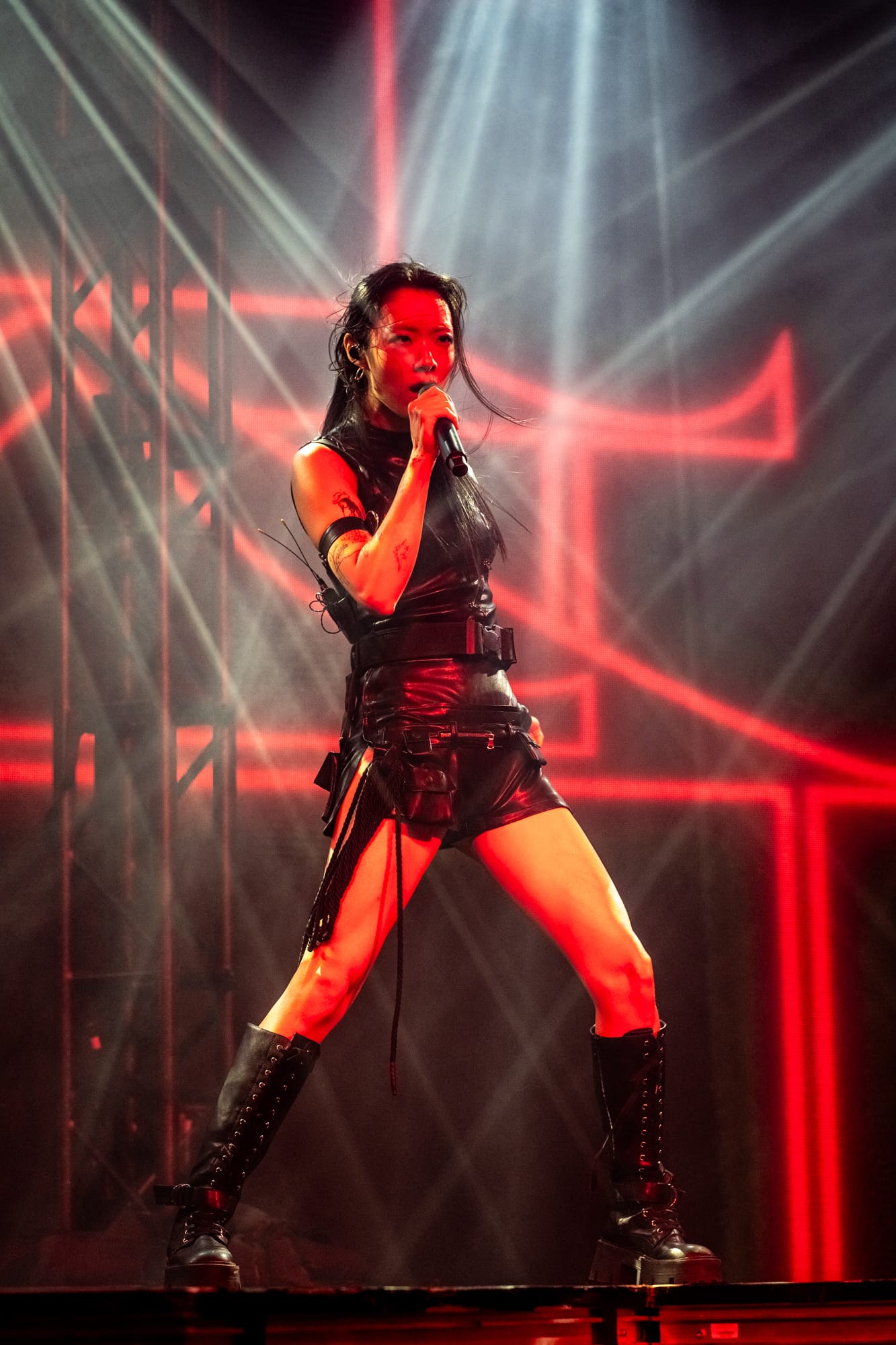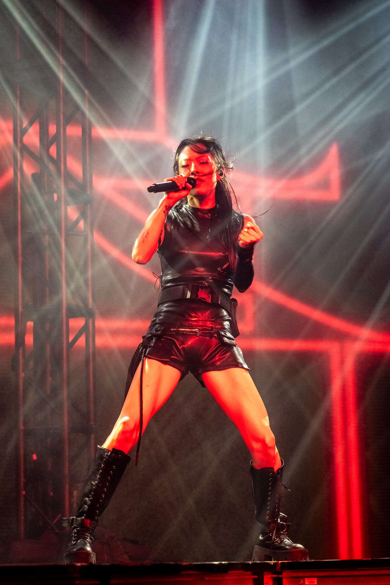 Once the interlude concludes, Rina’s backup dancers return to the stage, the lights flashing incredibly fast, making their dance moves look like they were from a Tim Burton stop-motion film. They danced in tandem as solid drumbeats punched the air. Rina returned on stage dressed in a black latex outfit and went straight into her song “Dynasty,” which, among my friends, is a definite favorite. Moving on from the melancholy stormy vibe of the first act, we transition to a darker theme, lit up by red lights; the second act includes heavier sounding songs like “Akasaka Sad,” “STFU!” and personally my favorite piece of hers, “Frankenstein.”